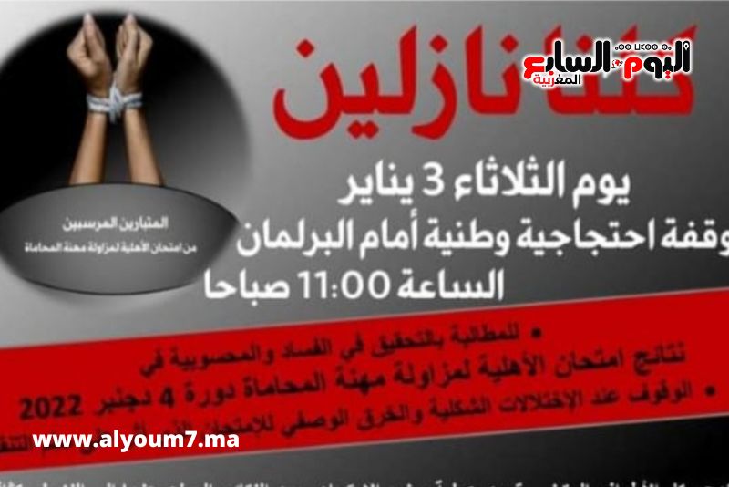 وتحت شعار: “كلنا نازلين”، دعت لجنة تتكون من المتبارين المرسبين من امتحان الأهلية إلى تنظيم وقفة احتجاجية وطنية، صباح يوم الثلاثاء 3 يناير الجاري أمام البرلمان للمطالبة بالتحقيق في الفساد والمحسوبية في نتائج امتحان الأهلية لمزاولة مهنة المحاماة دورة 4 دجنبر 2022 والوقوف عند الاختلالات الشكلية والفرق الوصفي للامتحان الذي أثر على سلم التنقيط.