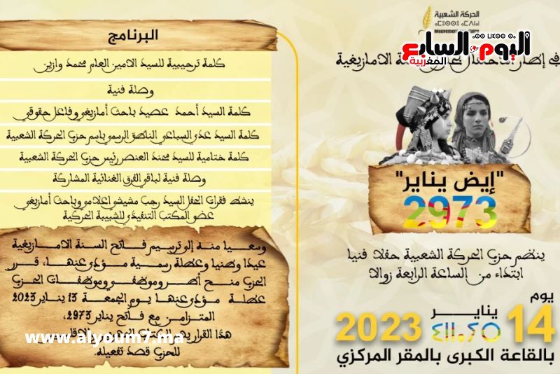 وفي إطار الاحتفال بحلول السنة الامازيغية “إيض يناير”، 2973، قال بلاغ إن حزب الحركة الشعبية، ينظم يوم السبت 14 يناير 2023، بالمقر المركزي للحزب حفلا فنيا. كما دعا البلاغ من جهة أخرى، أنه في سياق سعي الحزب لترسيم فاتح السنة الامازيغية عيدا وطنيا وعطلة رسمية مؤدى عنها، إلى قرار غير مألوف، وعجزت حكومة عزيز أخنوش تفعيله، يرمي إلى منح أطر وموظفي وموظفات الحزب عطلة مؤدى عنها، يوم الجمعة 13 يناير 2023، المتزامن مع فاتح يناير 2973، داعيا أيضا الكتاب الجهويين والإقليميين للحزب على المستوى الوطني إلى تفعيل هذا القرار.