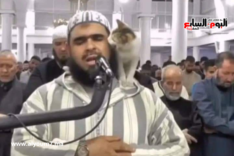 ورغم تركيز الامام في الصلاة واتمامها، عاملها بلطف وحضنها قبل أن تصعد على كتفه ثم حاولت مداعبة وجهه