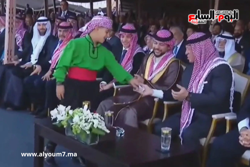 تداول نشطاء على مواقع التواصل الاجتماعي مقطع فيديو يظهر طفلا يسلم العاهل الأردني، الملك عبدالله الثاني ورقة خلال مراسم حفل العشاء الذي أقيم في مضارب “بني هاشم” في الديوان الملكي الأردني، الأربعاء.