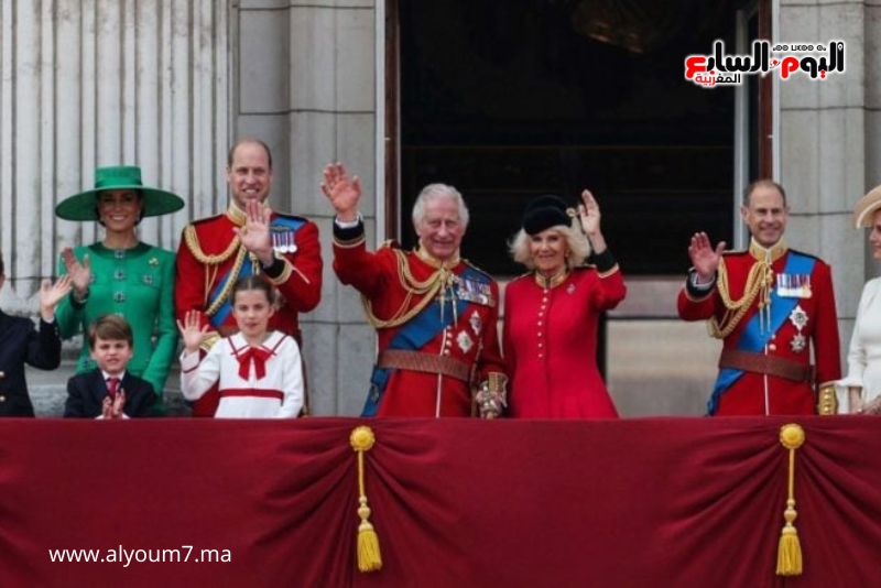 و بالعودة إلى قصر باكنجهام بعد ذلك، يجتمع الملك تشارلز مع أسرته في شرفة المبنى الشهيرة لمشاهدة تحليق نحو 70 طائرة عسكرية وهليكوبتر.