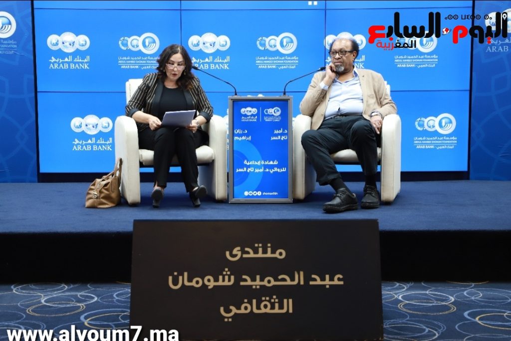“ استضاف منتدى مؤسسة عبد الحميد شومان الثقافي، ذراع البنك العربي للمسؤولية الثقافية والاجتماعية، الروائي السوداني أمير تاج السر، للحديث عن تجربته الإبداعية، وتحولاته الكتابية، قدمته فيها وأدارت الحوار مع الجمهور الناقدة الدكتورة رزان إبراهيم، بحضور السفير السوداني في عمان حسن سوار الدهب والعديد من المثقفين والأدباء والمعنيين.