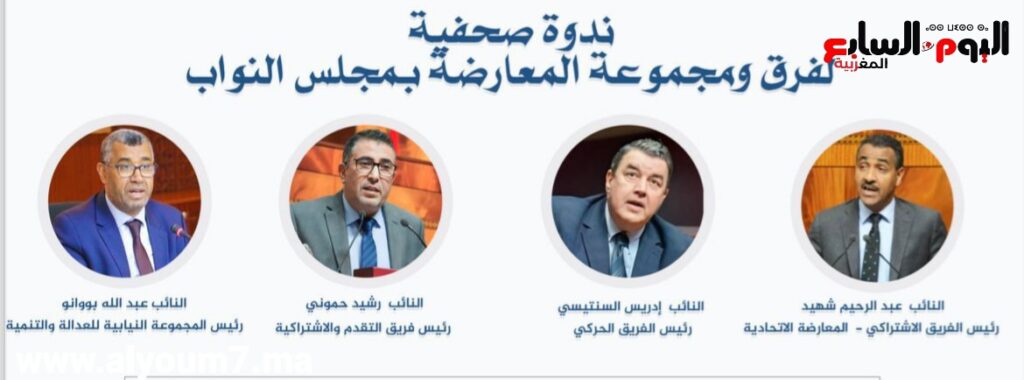 من المرتقب عقد ندوة صحفية، لفرق ومجموعة المعارضة بمجلس النواب، يؤطرها كل من النائب عبد الرحيم شهيد، رئيس الفريق الاشتركي( المعارضة الاتحادية)، النائب ادريس السنتيسي، رئيس الفريق الحركي، النائب رشيد حموني، رئيس فريق التقدم والاشتراكية، والنائب عبد الله بوانو، رئيس المجموعة النيابية للعدالة والتنمية، وذلك صباح يوم الخميس 08 فبراير 2024. بالقاعة المغربية في مقر المجلس.