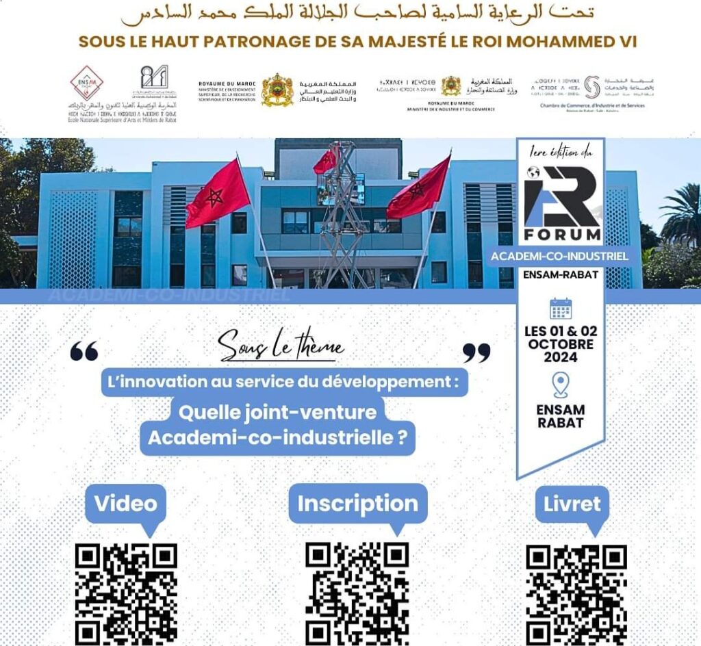 تحت الرعاية السامية لصاحب الجلالة الملك محمد السادس نصره الله وأيده، تنظم جامعة محمد الخامس بالرباط – المدرسة الوطنية العليا للفنون والمهن بالرباط، بشراكة مع غرفة التجارة والصناعة والخدمات لجهة الرباط -سلا -القنيطرة، المنتدى الأكاديمي-الصناعي الدولي الأول تحت شعار: “الابتكار في خدمة التنمية: أي مشروع مشترك أكاديمي صناعي؟”، وذلك يومي 01 و 02 أكتوبر 2024 بمقر المدرسة بالرباط.